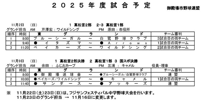 試合日程の発表は、毎週火曜日 13:00まで に、当ホームページ、ならびに以下の場所に掲示しますので、各チームの責任者はご確認ください。